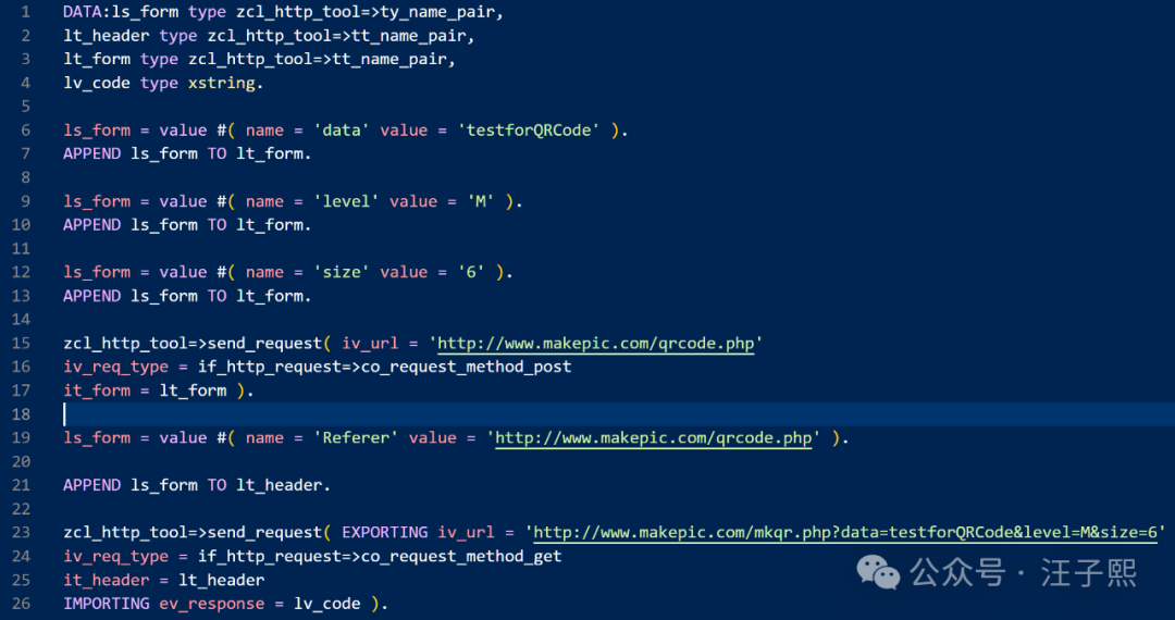 下面二十多行 ABAP 代码,封装了使用 CL_HTTP_CLIENT 将要生成二维码的字符串,通过 HTTP 请求发送给在线服务,并将包含二维码的图片数据,返回到 ABAP 端的功能。