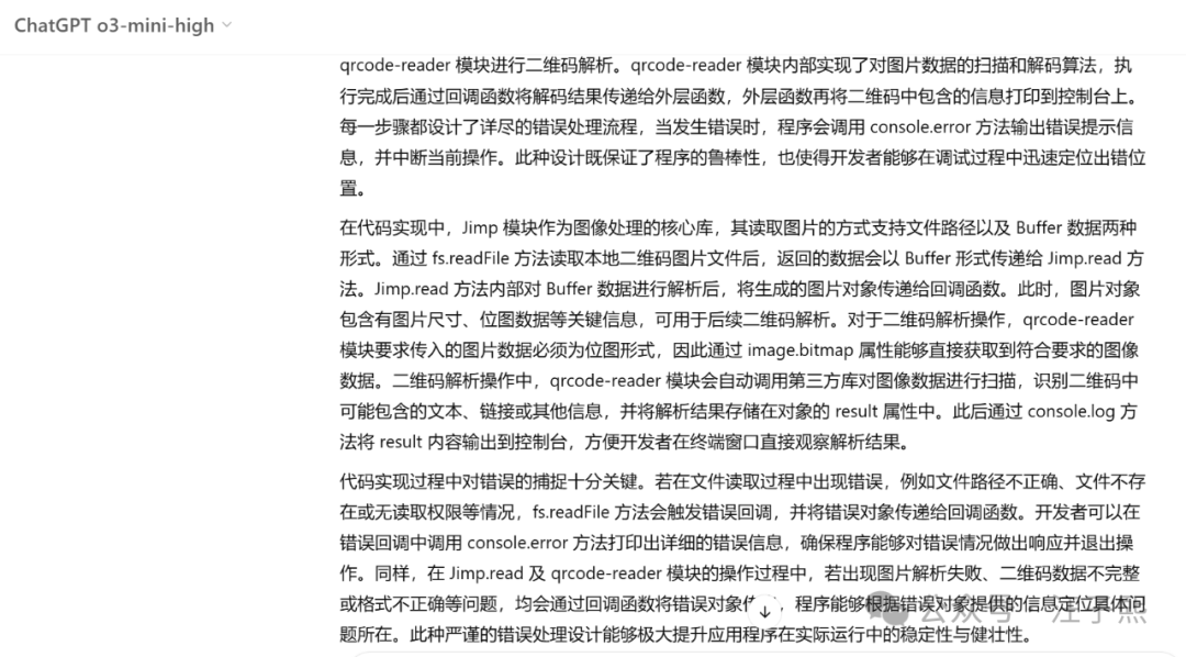 直接让 ChatGPT 给我写一个用 Node.js 解析二维码的程序,几秒钟就写好了,包含能够直接运行的源代码和原理说明。