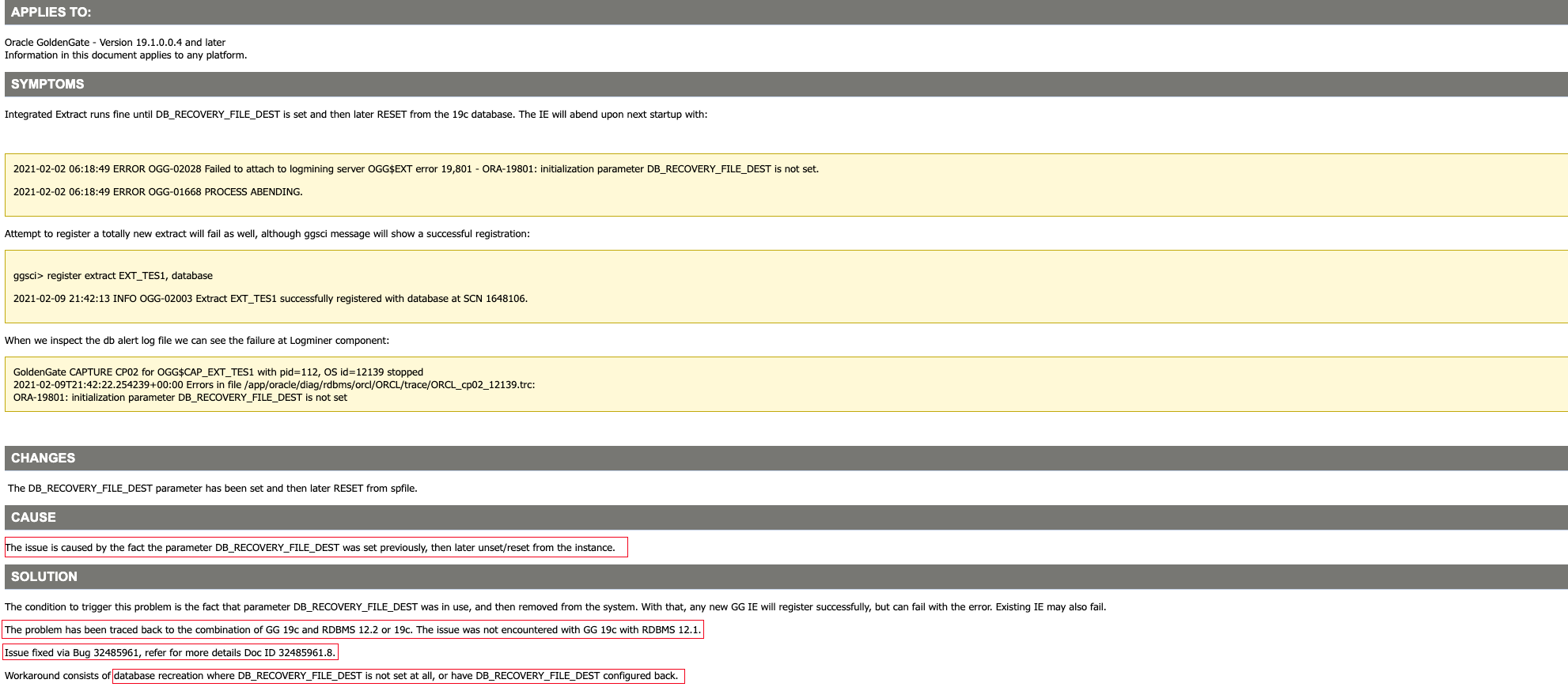 GG Integrated Extract (IE) Fails With OGG-02028 Failed to attach to logmining server ORA-19801: initialization parameter DB_RECOVERY_FILE_DEST (Doc ID 2794000.1)