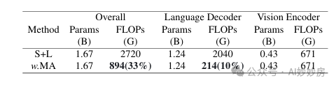 对于模型效率,我们报告了模型参数的数量和计算成本(以 GFLOPs 为单位)。每个输入样本包含一个由 Siglip 编码器处理的 728 个视觉标记的图像和一个长度为 64 的文本提示序列。此设置模拟了现实应用中典型的多模态输入场景。