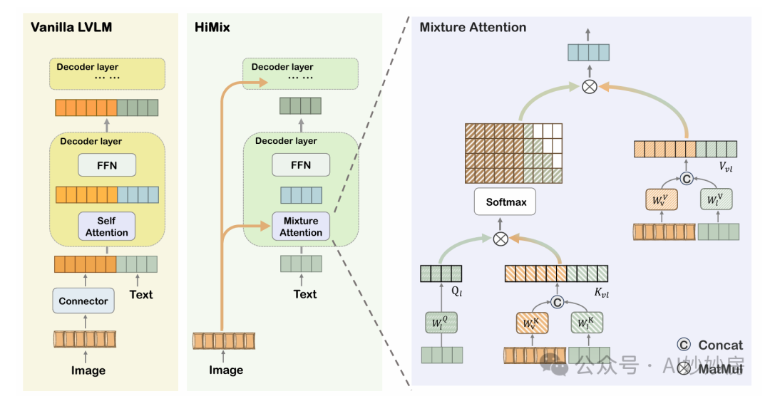 我们引入了用于混合注意力的分层视觉注入(HiMix),旨在降低计算复杂度的同时保持 LVLM 的性能。关键在于视觉序列不需要参与整个前向传播过程。在本节中,我们描述了分层视觉注入的设计和混合注意力的实现。图 3 的中间部分展示了 HiMix 的整体结构,而右侧展示了混合注意力的详细实现。