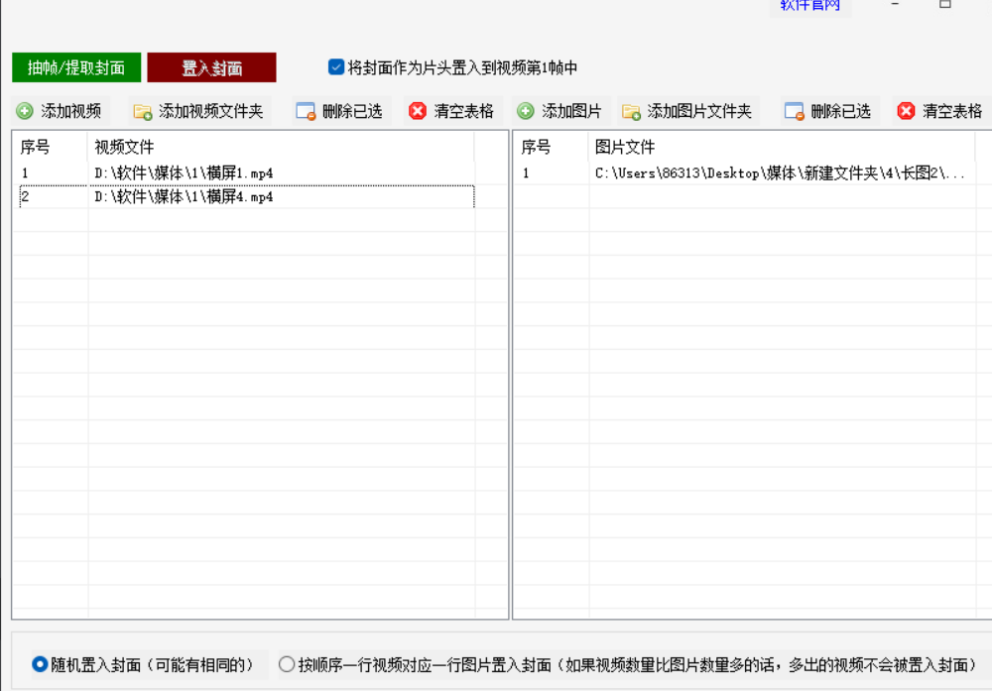 4.配置封面置入方式:勾选【随机置入封面】选项(因仅导入一张图片,实际效果为所有视频使用该封面),并勾选【将封面作为片头置入到视频第一帧中】,确保封面图片嵌入视频开头