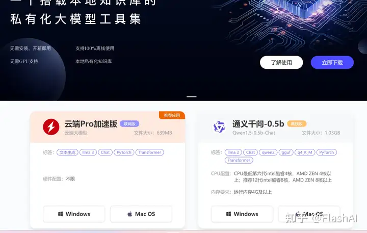 - 访问https://flashai.com.cn下载本地大模型+知识库的懒人整合包,需win10或者macos 12以上系统