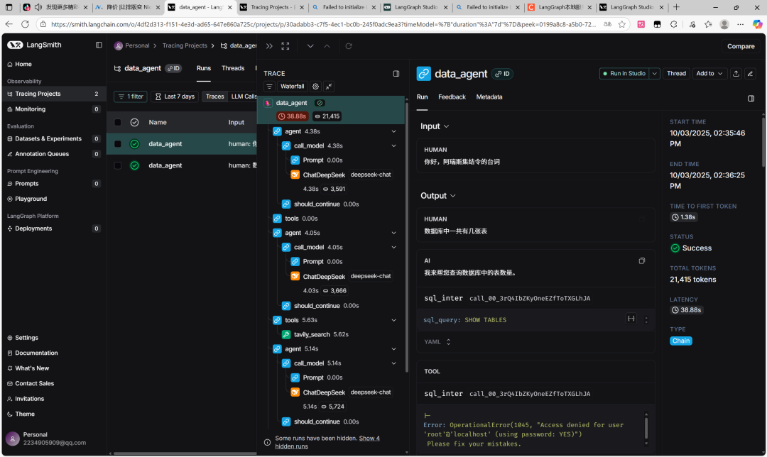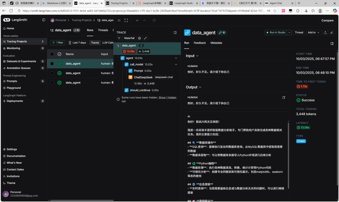 同时可以在langsmith中实时追踪智能体运行状态,只需要登录LangSmith官网,找到追踪的项目,就能看到每一次智能体的响应情况,至此后端服务就已经顺利部署上线。
