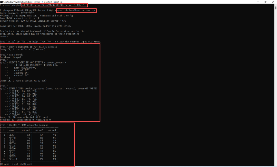 CREATE DATABASE IF NOT EXISTS school;USE school;CREATE TABLE IF NOT EXISTS students_scores ( id INT AUTO_INCREMENT PRIMARY KEY, name VARCHAR(50), course1 INT, course2 INT, course3 INT);INSERT INTO students_scores (name, course1, course2, course3) VALUES('学生1', 85, 92, 78),('学生2', 76, 88, 91),('学生3', 90, 85, 80),('学生4', 65, 70, 72),('学生5', 82, 89, 95),('学生6', 91, 93, 87),('学生7', 77, 78, 85),('学生8', 88, 92, 91),('学生9', 84, 76, 80),('学生10', 89, 90, 92);