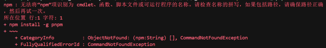 若出现如下错误,意味着你的系统找不到 npm 命令,可见《Node.js前端小白入坑指南:为什么你的电脑找不到 npm 命令?》解决。