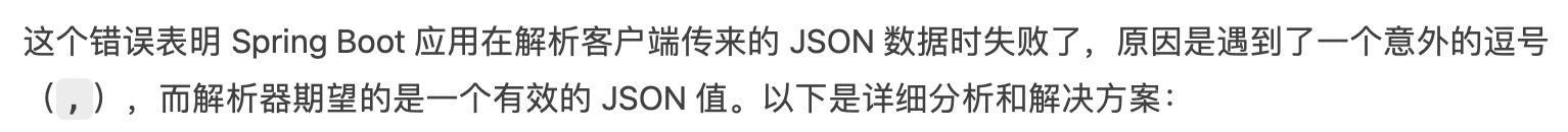 2025-04-11 20:37:05.685 WARN 46462 --- [nio-8080-exec-1] .w.s.m.s.DefaultHandlerExceptionResolver : Resolved [org.springframework.http.converter.HttpMessageNotReadableException: JSON parse error: Unexpected character (',' (code 44)): expected a value; nested exception is com.fasterxml.jackson.core.JsonParseException: Unexpected character (',' (code 44)): expected a value<EOL> at [Source: (org.springframework.util.StreamUtils$NonClosingInputStream); line: 2, column: 9]]
