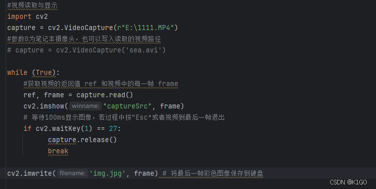 cv2.VideoCapture(r"E:\111.MP4"),用于读取指定路径的视频文件。capture.read(),返回一个布尔值 ref(表示读取是否成功)和一帧图像 frame。cv2.imshow("captureSrc", frame),在窗口中显示当前帧。cv2.waitKey(1) == 27,等待 1 毫秒,若按下 "Esc" 键(ASCII 码 27),则退出循环。capture.release() 和 cv2.destroyAllWindows(),确保资源被正确释放,窗口被关闭。cv2.imwrite('img.jpg', frame),将最后一帧保存为图片文件。
