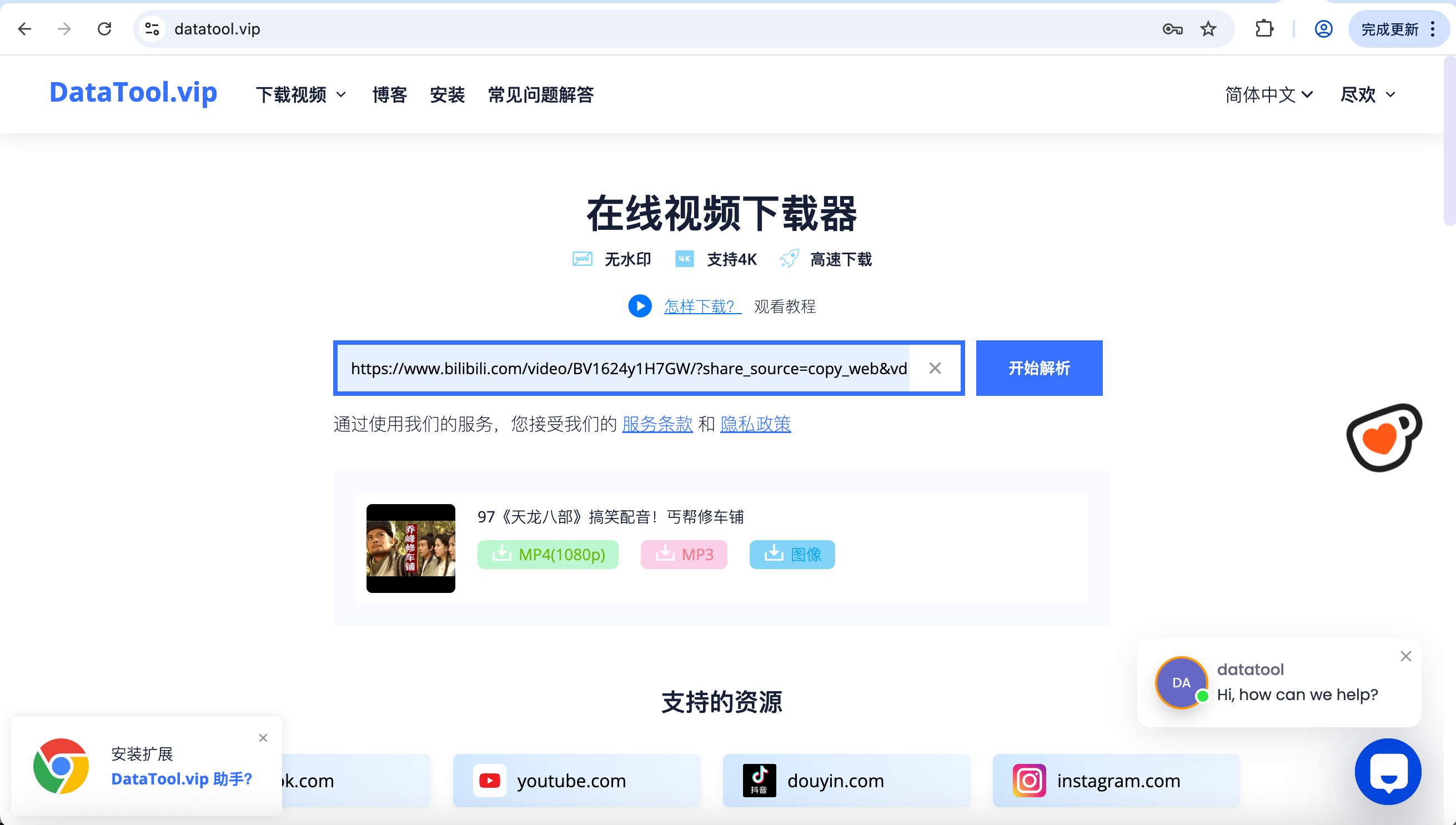 像常见的抖音、西瓜视频、小红书、哔哩哔哩等平台的视频文案,可以用在线视频下载器这个网站把视频或音频下载下来,然后用上文提到的语音识别模型把文案提取出来