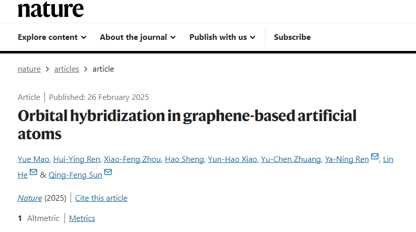 2月26日,北京大学孙庆丰教授联合北京师范大学何林教授和任雅宁博士在《Nature》上发表论文,相关成果以“Orbital hybridization in graphene-based artificial atoms”为题,第一作者为 Yue Mao, Hui-Ying Ren和 Xiao-Feng Zhou为共同一作。