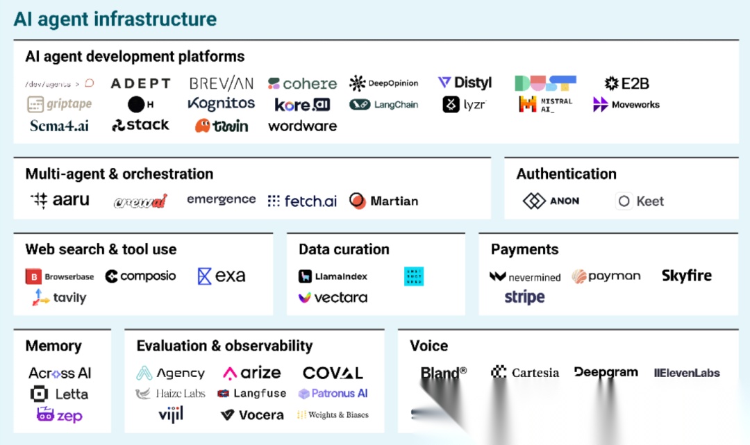 - 支付与语音:支付领域涌现出为智能体打造加密钱包、虚拟卡的公司(如 Skyfire);语音领域则涵盖 AI 语音应用测试平台、语音模型开发工具(如 Deepgram、VAPI)。