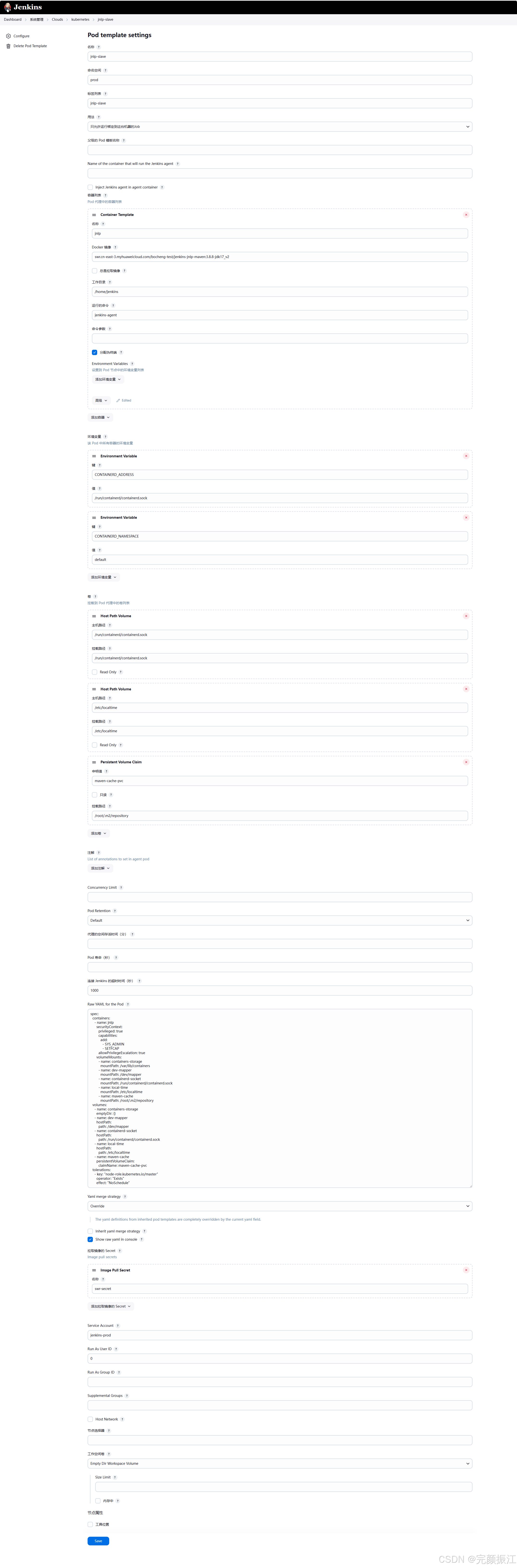 Raw YAML for the Pod内容(让slave跑在root权限,为了编译推送镜像用)