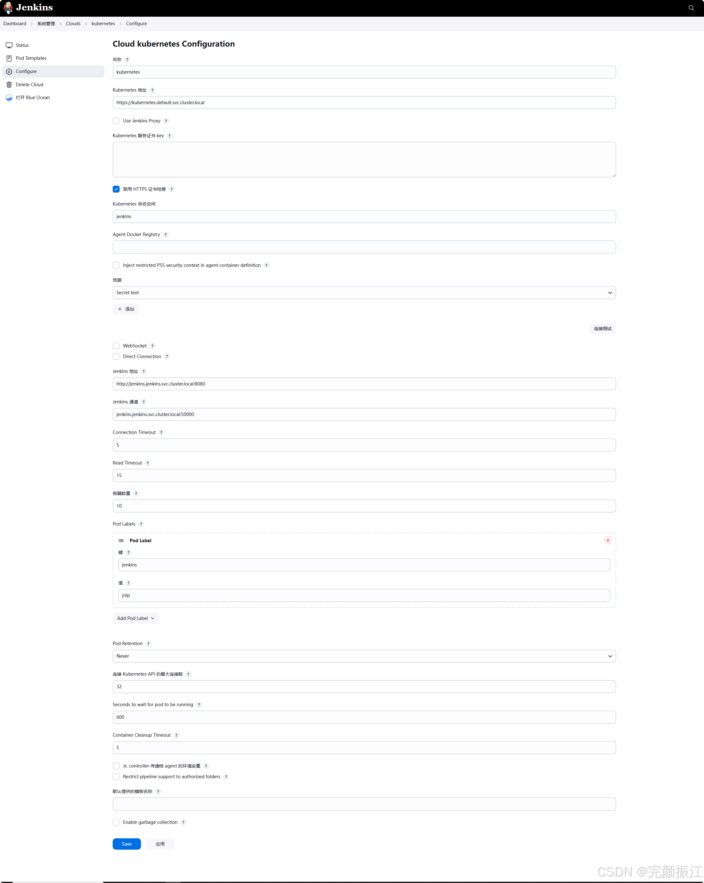 📌 **保存建议**:点击 “Save” 保存配置后,可在 Jenkins 的“Manage Nodes”中查看是否能成功创建 Pod 并执行任务。