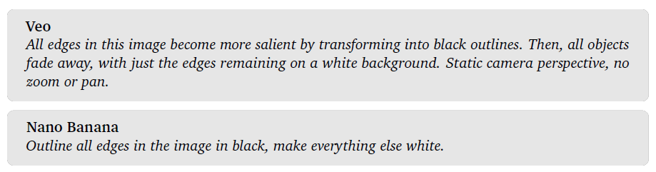 尽管未经过专门训练,Veo 3仍可通过提示来检测边缘,进而感知边缘。图3详细展示了Veo 2和Veo 3的边缘检测性能(通过OIS衡量;详情和提示参见B.1节)。虽然Veo 3(0.77 pass@10)尚未达到特定任务的最先进水平(0.90)[60],