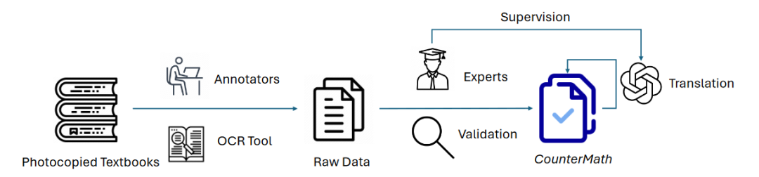 我们完整的数据构建流程如图2所示,我们首先招募了几位的数据标注员,使用OCR工具从教材中提取出了1,274条语句-理据对。接下来,作者中具有应用数学学士学位的专家对上一阶段的所有数据点进行人工核对,根据每条语句的理由将其标注为"真"或"假",并过滤剔除歧义对,由此产生了1216个数据样本作为我们数据集的最终版本。此外,由于数据来源为中文,我们使用GPT - 4o将数据集翻译成英文,并对翻译后的数据集进行了进一步的验证,以确保其正确性和适当性。