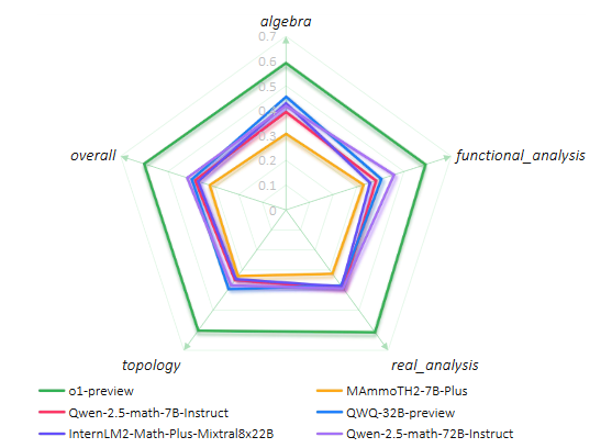 团队进一步对COUNTERMATH中四个不同的领域进行了细粒度的分析,挑选了不同参数大小的6个不同模型,具体结果如图6所示。我们注意到,从模型性能来说,o1在每个领域均大幅领先其余模型,而每个领域展现出的性能较为平均。其余的开源模型中,我们注意到在代数和泛函分析的性能普遍更优,而在拓扑和实分析的性能更差。这说明:大模型在高等数学的 “冷门领域” 存在严重知识缺口。
