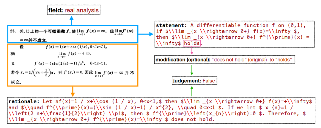 我们的数据集是由一系列聚焦于不同领域反例的数学教科书构建的,例如代数,拓扑,实分析和泛函分析。我们已经获得了原教材作者的同意,只将他们的出版物用于学术研究目的。由于原始数据来源为中文,我们还将数据集翻译成英文,创建了一个基于反例的数学概念推理基准,命名为COUNTERMATH。