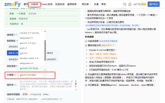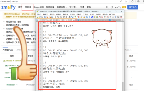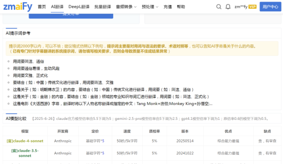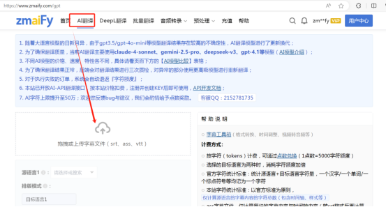 在 zmaify 官网切换到 “AI 翻译” 页面,上传刚拿到的 srt 字幕文件。 - 选目标语言 & 模型