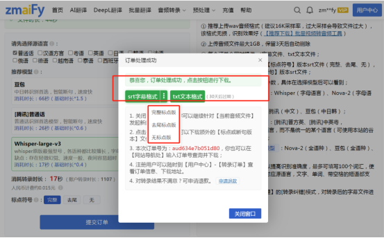 一会儿工夫,系统就把音频转成 srt 字幕文件和 txt 文本啦,还能选不同标点符号版本,直接下载用!