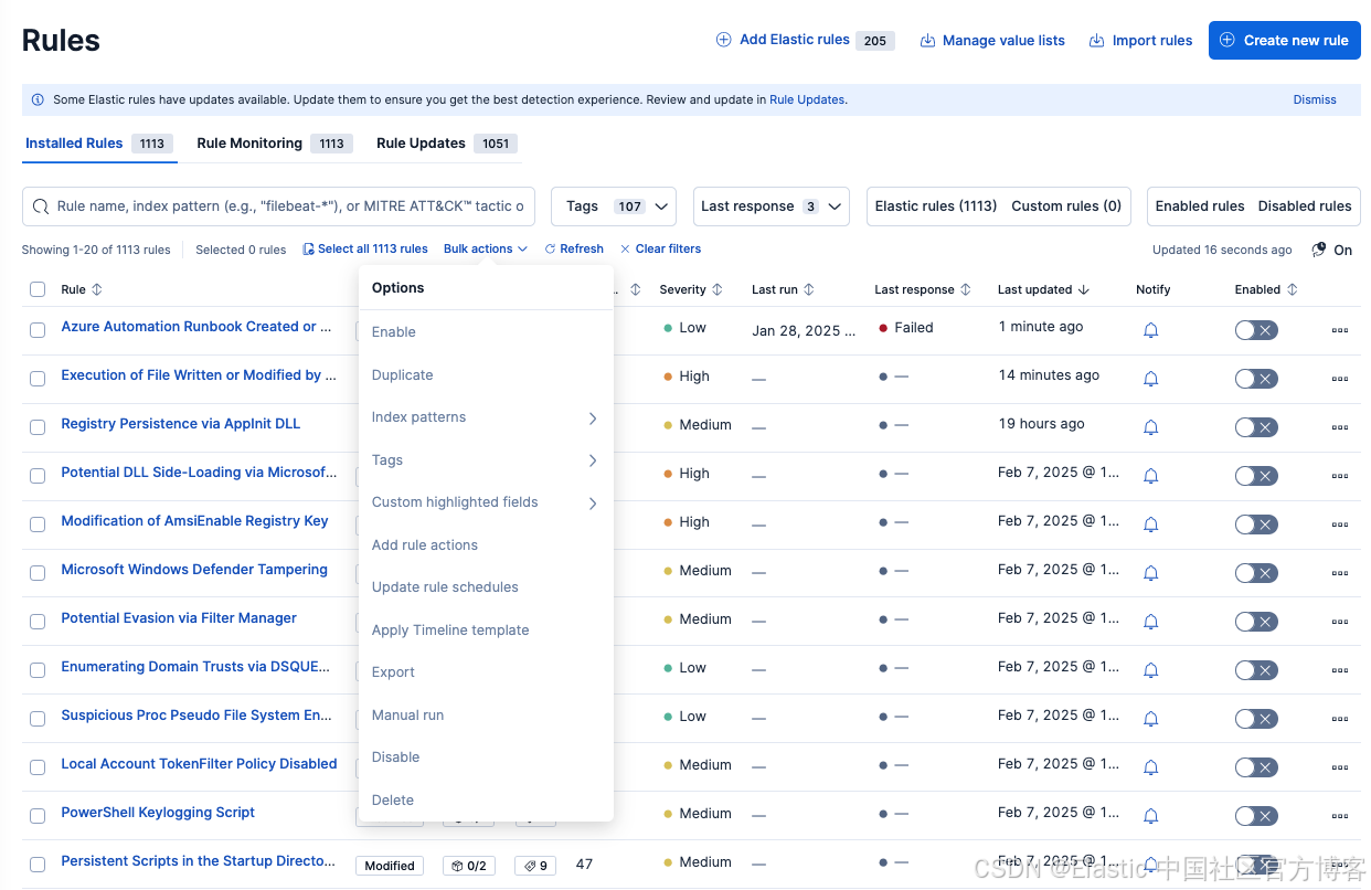 安全团队通常会根据特定需求定制这些预构建的检测规则,无论是修改数据源、优化检测逻辑、调整警报抑制,还是配置自动化。 从 8.18 和 9.0 版本开始,检测工程师可以在不丢失自定义修改的情况下应用 Elastic 提供的规则更新,无需复制规则和手动迁移更改。