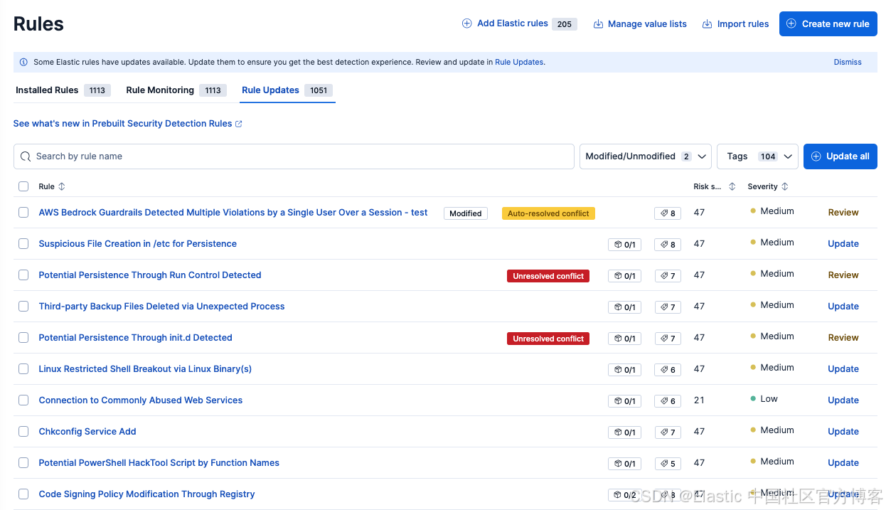 在规则更新表格中,检测工程师可以看到哪些规则需要他们关注,他们可以按修改/未修改规则进行筛选,并按严重性和风险评分排序,以确保优先更新高优先级的规则。