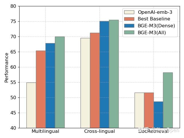 三个公开数据集上评测:多语言(Miracl),跨语言(MKQA),长文档搜索(NarrativeQA)OpenAI-emb-3 评测结果来自其官方博客,其余为智源团队自测