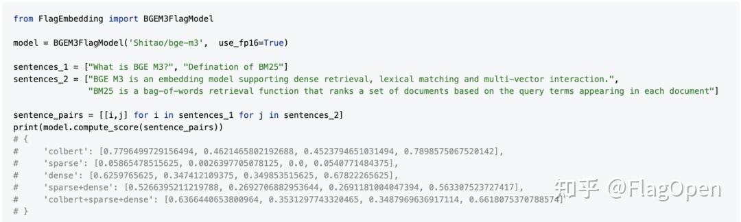 在BGE-M3模型中,输入一个文本对,可同时得到三种模式的分数,三种模式同时又可相互组合得到新的总分。
