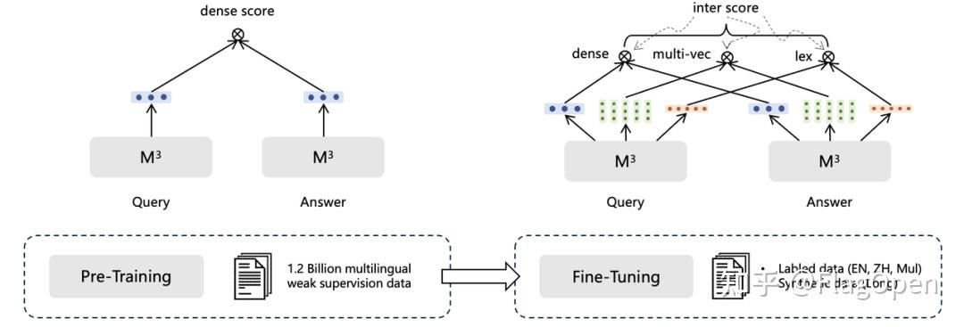 如BGE模型一致,BGE-M3模型训练分为三个阶段:1)RetroMAE预训练,在105种语言的网页数据和wiki数据上进行,提供一个可以支持8192长度和面向表示任务的基座模型;2)无监督对比学习,在194种单语言和1390种翻译对数据共1.1B的文本对上进行的大规模对比学习;3)多检索方式统一优化,在高质量多样化的数据上进行多功能检索优化,使模型具备多种检索能力。其中,一些重要的关键技术如下: