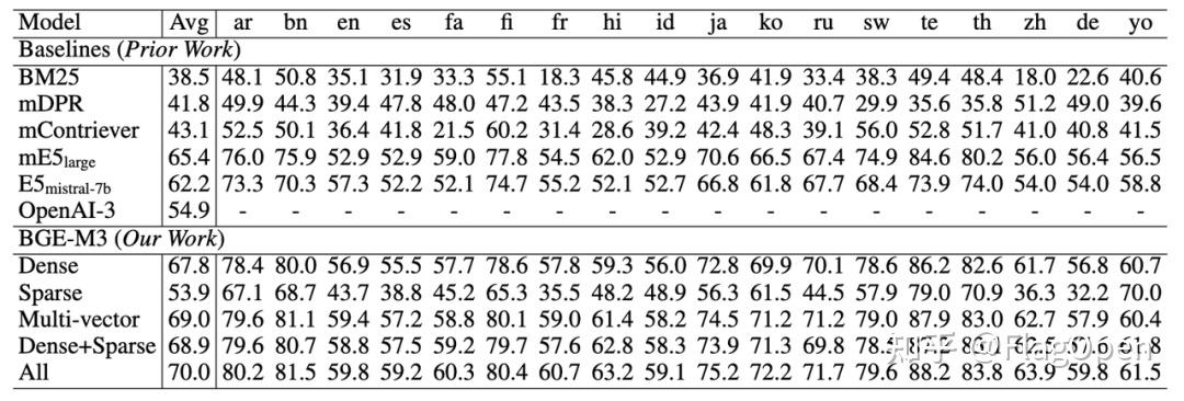 在多语言评测上,BGE-M3稠密向量(Dense)检索能力在每种语言上都实现了有竞争力的效果,整体水平显著优于此前的基线向量模型(如mE5)。稀疏检索(Sparse)大幅超过了传统的稀疏匹配算法BM25。多向量检索(multi-vector)则获得了三种检索方式中的最佳效果。与此同时,BGE-M3通过搭配多种检索方式以进一步提升检索质量。如下表所示,稠密与稀疏搭配的方法(Dense+Sparse)超过了使用单一手段的检索效果,联合使用三种检索方法(All: Dense+Sparse+Multi-cector)则可以获得最优的结果。