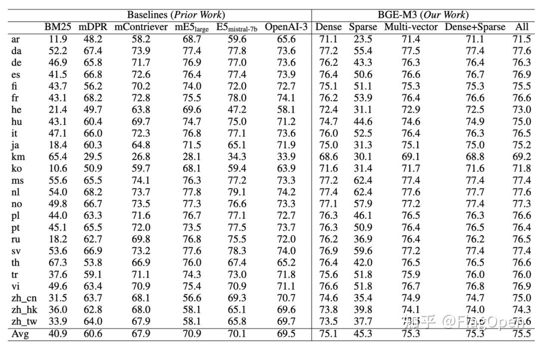 BGE-M3训练集包含100+种以上语言,既包含每种语言内部的语义匹配任务(Language X to Language X),又包含不同语言之间的语义匹配任务(Language X to Language Y)。丰富且优质的训练数据帮助BGE-M3建立了出色的多语言检索(Multi-Lingual Retrieval)与跨语言检索能力(Cross-Lingual Retrieval)。