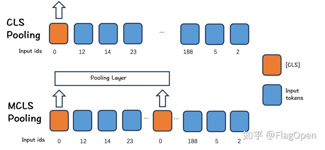 目前,开源社区缺少用于文档级检索的开源数据集。为此,我们借助大语言模型生产了一份包括13种语言的长文档检索数据。另外,由于缺乏长文本数据或计算资源,实际情况下长文本微调不一定可以进行。在这种情况下,我们提出了一种简单而有效的方法:MCLS(Multiple CLS)来增强模型的能力,而无需对长文本进行微调。如下图所示,MCLS方法旨在利用多个CLS令牌来联合捕获长文本的语义。具体来说,我们为每个固定数量的令牌插入一个cls令牌,每个cls令牌可以从相邻的令牌获取语义信息。最后,通过对所有cls令牌的最后隐藏状态求平均值来获得最终的文本嵌入。