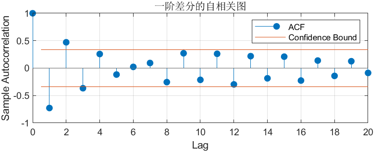 你的代码里对 “一阶差分序列” 画了 ACF 图(autocorr(diff(sales))),输出的图长这样(示意图):