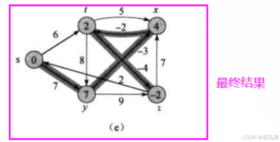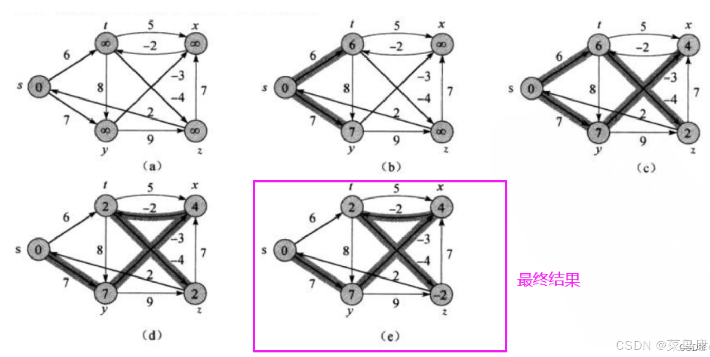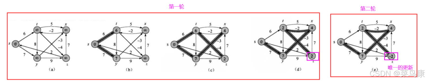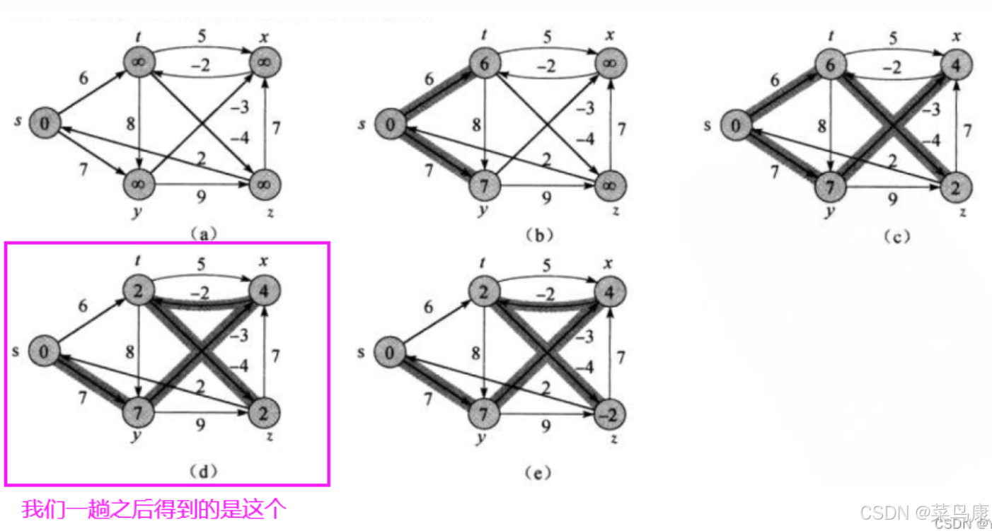 此时就得到了最终结果,所以我们看到这里这个图起始更新了两轮(后面代码写出来我们也可以验证一下是不是两轮)就得到了最终结果,后续即使再进行迭代,也不会有新的路径更新了。 所以我们说了可以提前结束,不一定非要迭代V-1 次, V 是图中顶点的数量