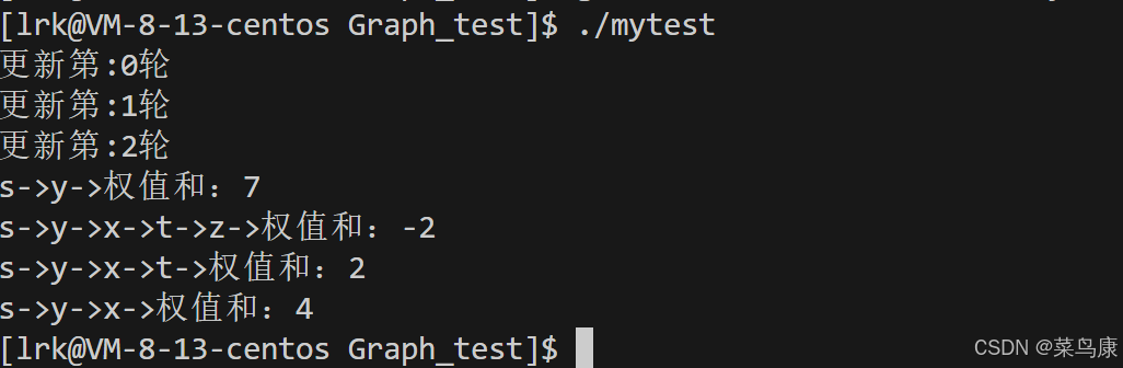 n次(0 到 n-1),是因为第 0 轮是初始化后的第一次更新。 update标记本轮是否有任何距离被更新。如果没有,说明已经收敛,可以提前退出。- 输出当前是第几轮,便于调试。