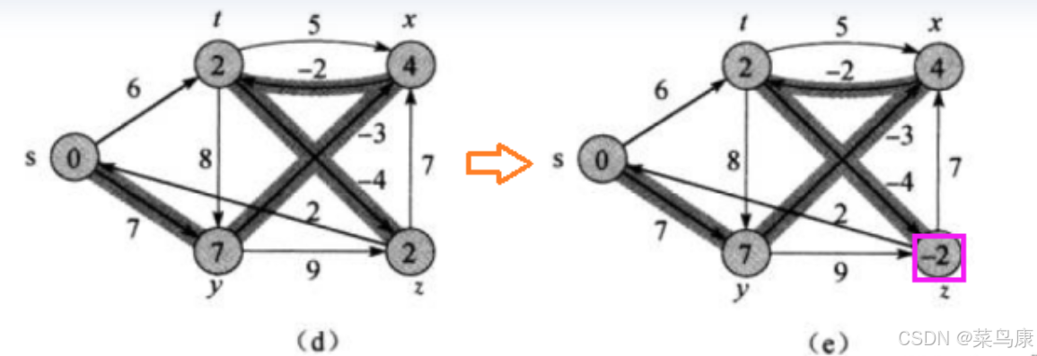 首先第一个还是s顶点,那这里没有边需要更新; 然后是y,也没有边更新; 接着z,也没有更新; 再下面t,更新一条:现在t的最短路径是2,t->z是-4,所以z的最短路径更新为-2