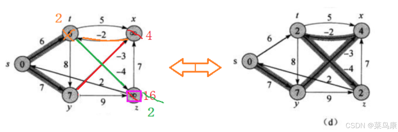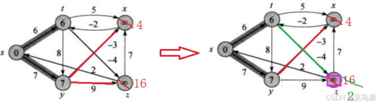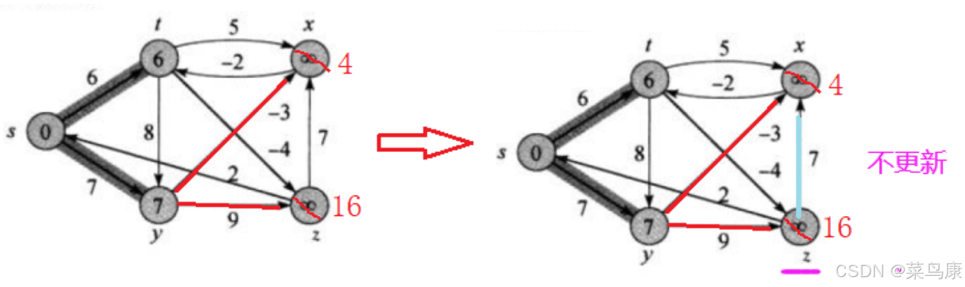 t连出去了两条t->z和t->x,只更新t->z,那之前的s->y->z(16)就不再是z目前的最短路径了(当然实际写代码中的话我们的两个数组:路径距离/权值的数组dist 和 存储路径的数组pPath就也需要相应的修改) 最后是x