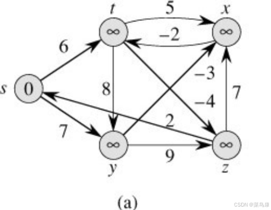 首先,起始状态时,s位为源点,对s的相邻顶点进行松弛(当然实际中应该是按照顶点在邻接矩阵里面存储的顺序去遍历的,那其实这个图和我们上一篇文章讲Dijkstra算法的那个图顶点都是一样的,只是权值不同,所以下面我们就按之前的存储顺序去走) 那s的话这里他连出去的两条边肯定都会更新(因为源节点s到当前结点u(这里就是s) 的代价与u 到v 的代价之和是否比原来s 到v 的代价更小) 那第一次松弛之后如下: