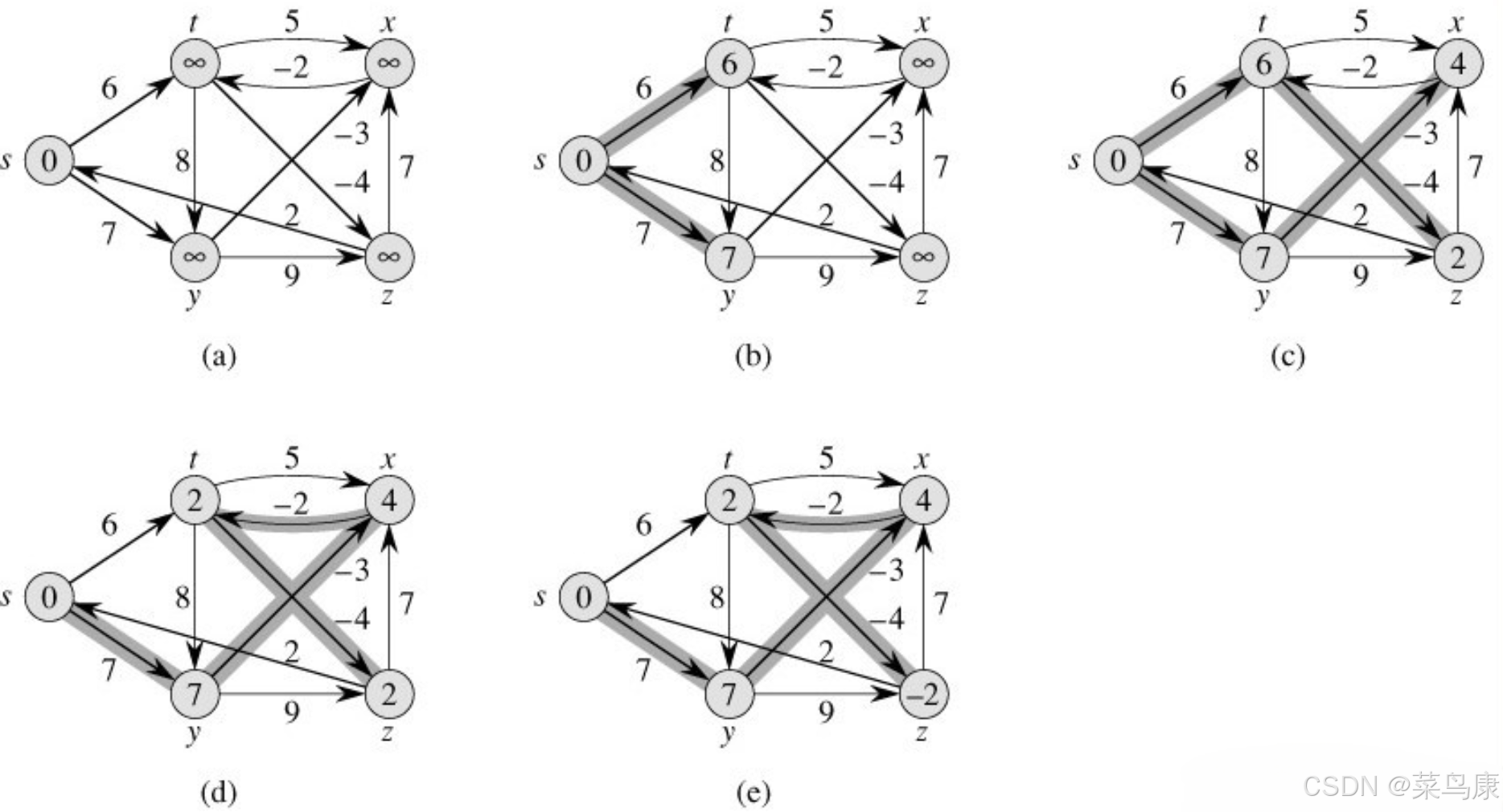 为什么呢? 因为第一轮t的最短路径更新为s->t(6)之后,后面又变成了s->y-x-t(2)