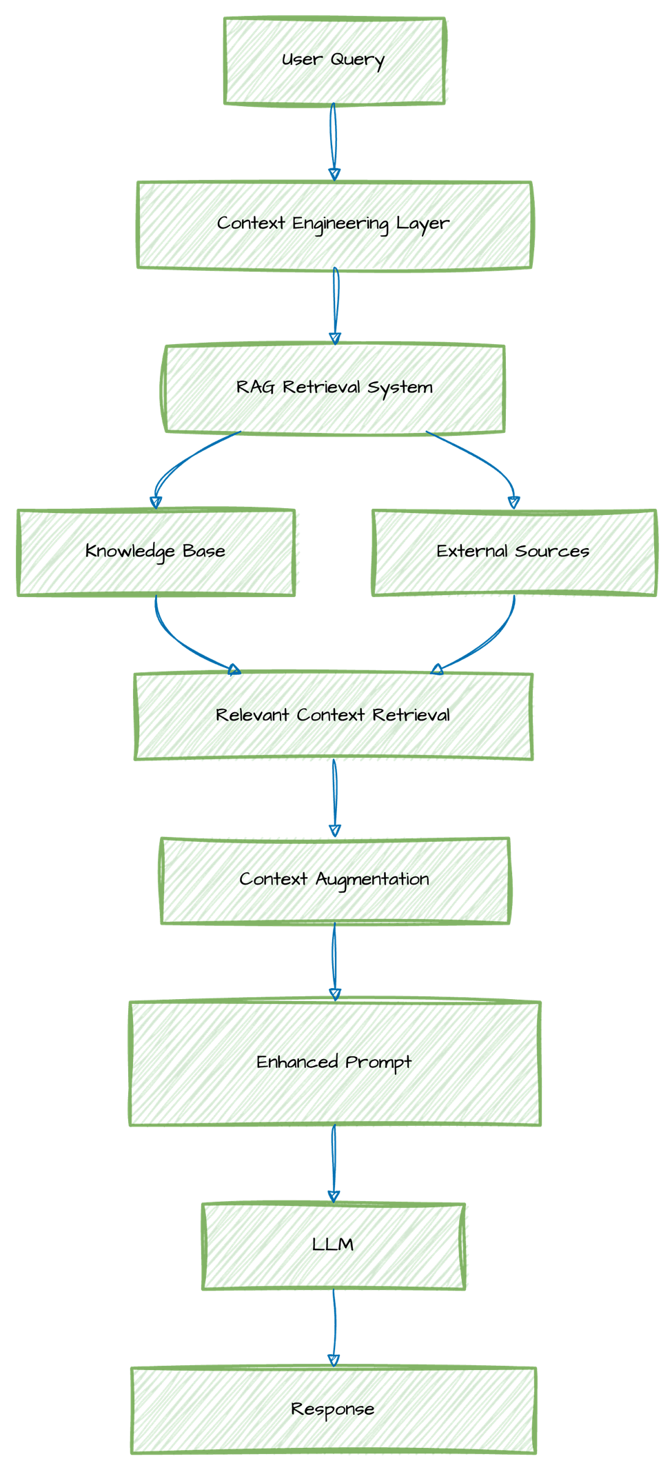 动态知识整合:RAG提供新颖、相关的信息,供上下文工程框架进行系统处理。AI不再依赖静态知识,而是能够获取最新数据、文档和特定领域的信息。