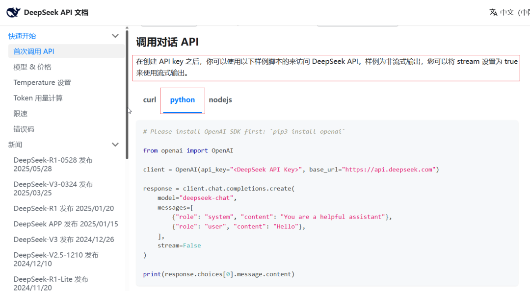 代码案例的话,deepseek官网就有提供最简单的案例: