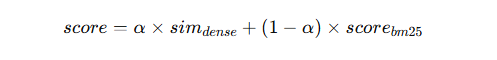 分别运行 BM25(或 BM25F)和向量检索,得到两个分数,再做归一化并加权融合: