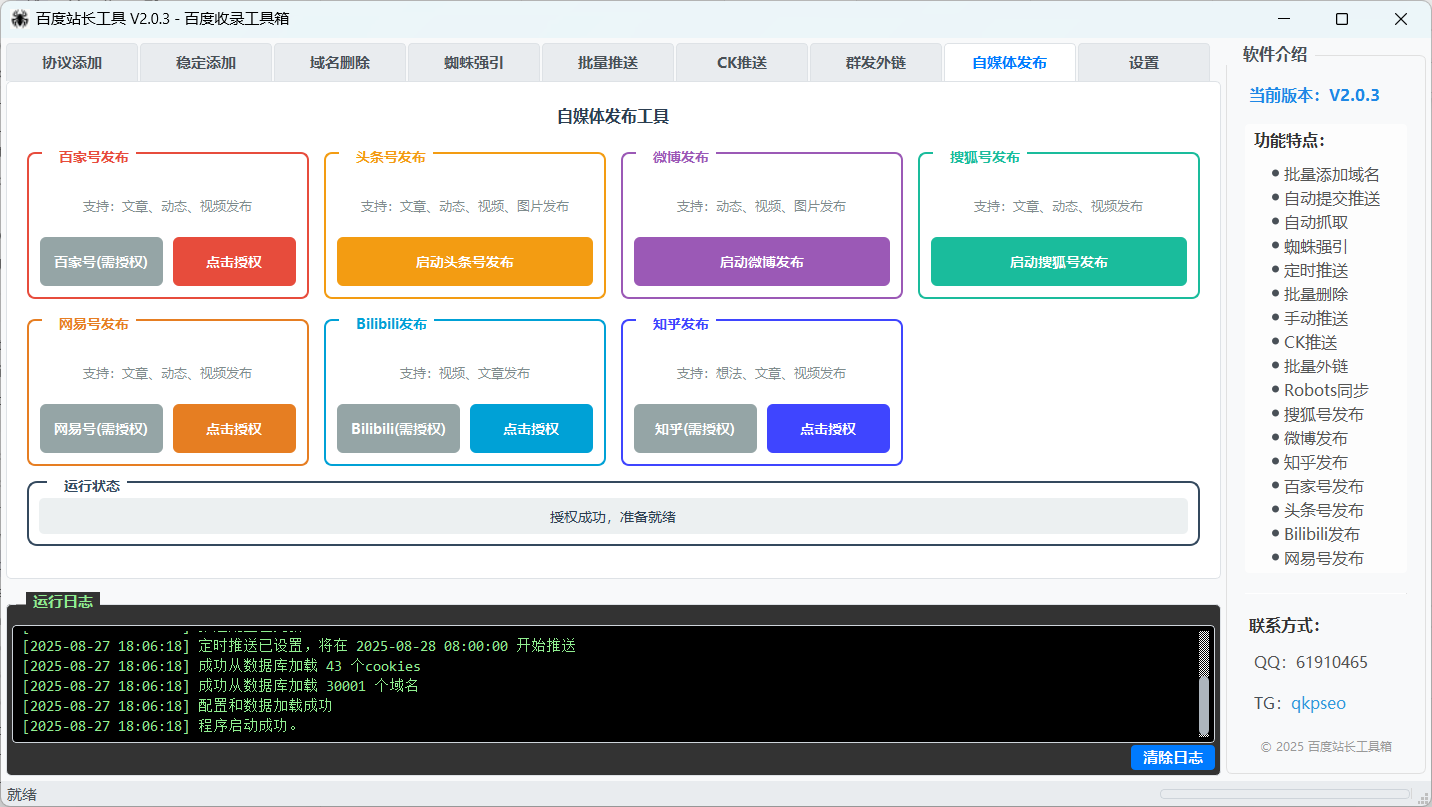 百度推出"域名批量管理工具箱",提供一站式自动化解决方案,支持域名批量添加、删除、推送及蜘蛛强引收录功能。最新2.0版本新增百家号、头条号、搜狐号、微博、网易号、Bilibili,知乎批量发布,支持自动操作与高效管理,,优化了代理IP逻辑和操作稳定性。该工具具备多线程处理、Cookie管理、多种推送方式、数据库管理及日志记录等核心功能,支持自动更新和个性化配置,帮助用户大幅提升