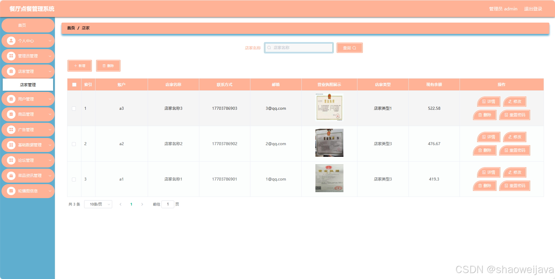 4. 店家管理:添加、编辑、删除店家账号。