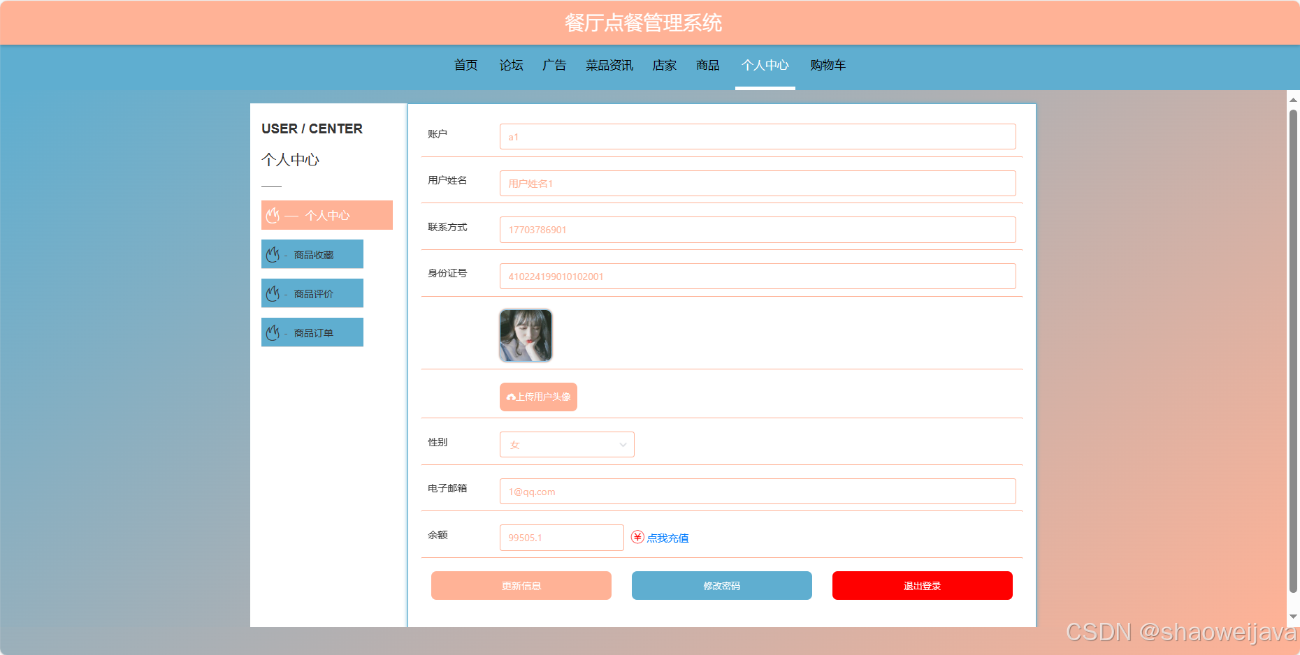 7. 个人中心:用户可以管理个人信息,包括修改密码、更新个人资料等。