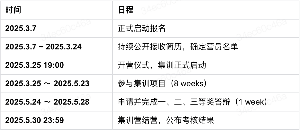 本次启航计划集训营为期 2 个月,以双周报提交形式进行阶段性汇报总结。整体的安排节奏如下表,没有参与过启航计划的同学可以留步围观哦~