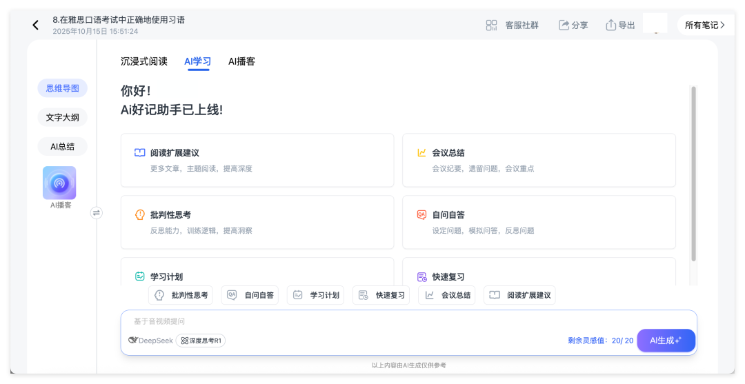 它内置了6种视频学习模式,可以随时与 AI 对话,比如:一键会议总结、批判性思考、阅读拓展计划等。