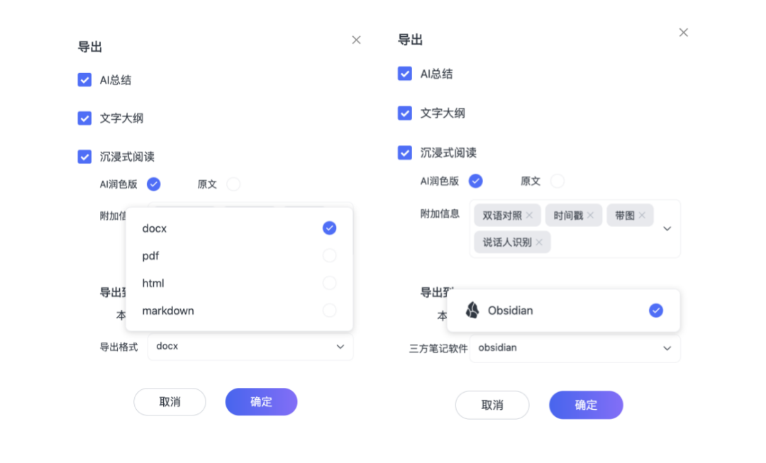 目前知识库存储空间不限量,支持本地导出 + Obsidian 同步。