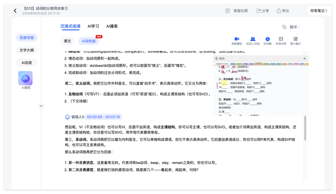 我一边看,一边划重点做标记,AI会自动记录我的批注内容,这已经不是传统意义上的笔记软件,而是一个实时理解系统!当这些上线后,它几乎就是一站式学习AI Agent,你所有的信息输入都能在这里被结构化、被理解、被学习。这里会自动把视频里的 PPT、讲解画面、语音识别的文字稿,全都整理成图文笔记,还能同步小窗播放视频。中文、英文都行,声音、语气、角色名都能自定义,播放时文字稿还能实时滚动,像在听一档专业