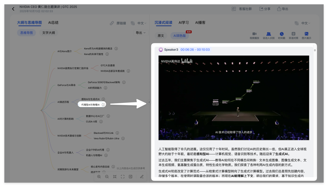 这里会自动把视频里的 PPT、讲解画面、语音识别的文字稿,全都整理成图文笔记,还能同步小窗播放视频。
