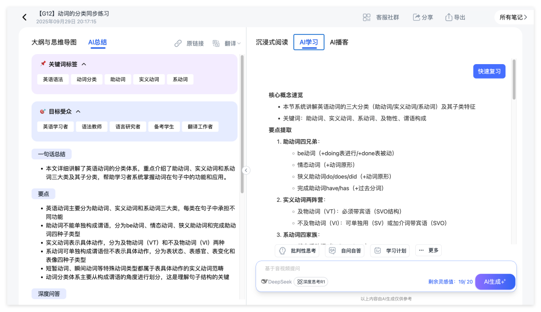 举个例子,我上传了一段英语学习的视频,它自动帮我提炼出总结和要点,以及关键词标签。